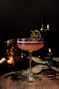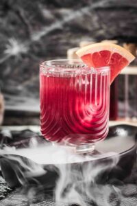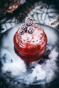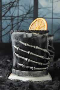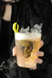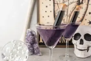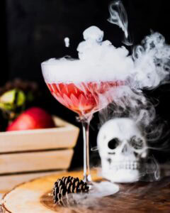 This black magic rum Halloween cocktail is a bold and eye-catching drink that adds instant spookiness to any October party. The shimmering purple base turns jet black with a pour of activated charcoal-infused rum. It’s not just about the look either. With the fruity flavors of grape, cranberry and strawberry, it’s as tasty as it is dramatic. Add edible glitter or pearl dust if you want extra shimmer. It’s fun, flavorful and absolutely unforgettable.Spirit: Strawberry Rum & Purple Grape Schnapps