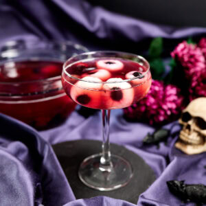 An eerie and delicious Halloween punch, this cherry drink has eyeballs floating in it! Spike with vodka or make it alcohol-free, it's wonderful either way!Spirit: Vodka