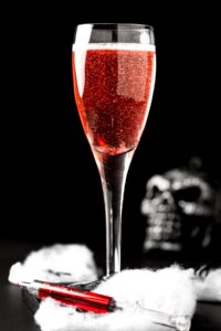 This red Halloween mimosa is a simple Halloween cocktail to serve guests at a spooky themed party. It’s easy to make with a homemade mixed berry simple syrup.Spirit: Champagne or Prosecco.