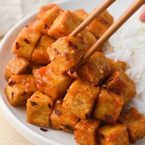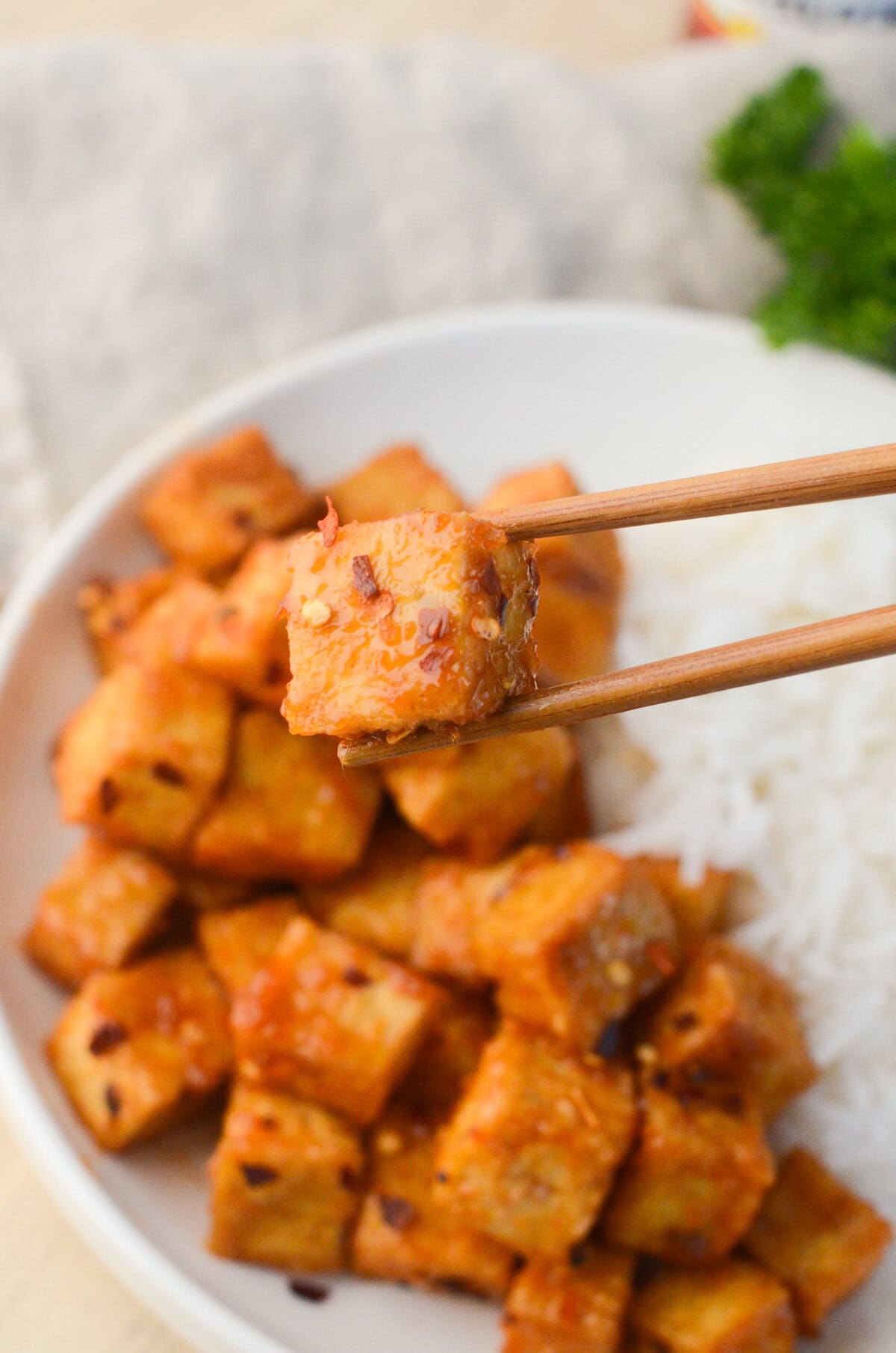 Hot honey is all the craze right now – and as the tofu obsessed home chef that I am – I knew it was time to try this on some tofu. And this crispy hot honey tofu did not disappoint. You all love my other 20+ tofu recipes on the site, so I am almost positive you are going to LOVE this one too. If you follow a strict vegan diet, there are honey alternatives that I list below. You know I’m all about simple weeknight dinners, and this one adds to my list of quick, simple high protein recipes that goes great with rice and veggie of choice.