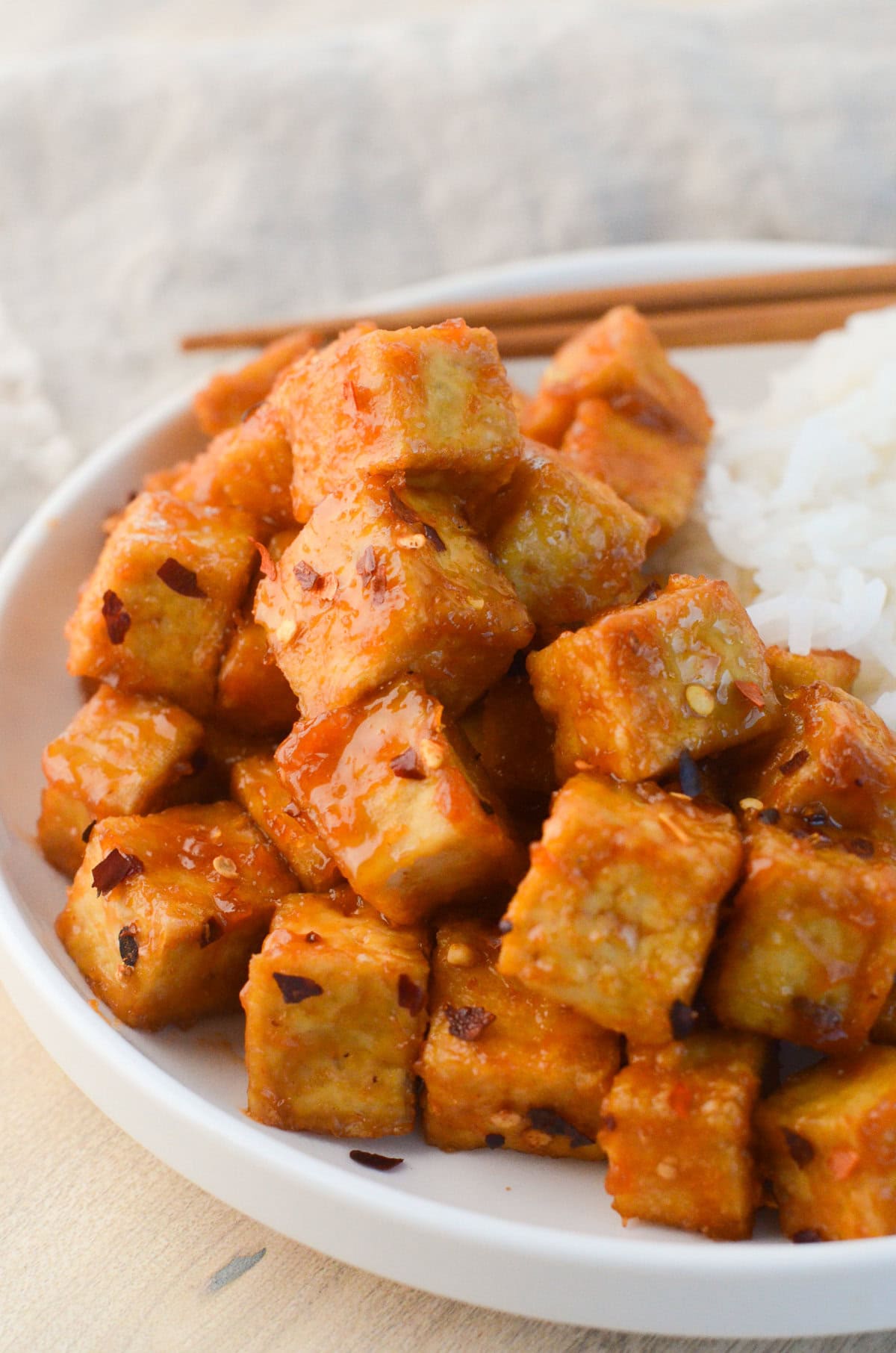 - Serve your tofu with a grain of choice (rice, quinoa, barley, etc) or noodles and a side of veggies (broccoli, peppers, asparagus, etc). Top with more red pepper flakes for more heat if desired. I love honey so I will finish off my plate with a little drizzle of honey!