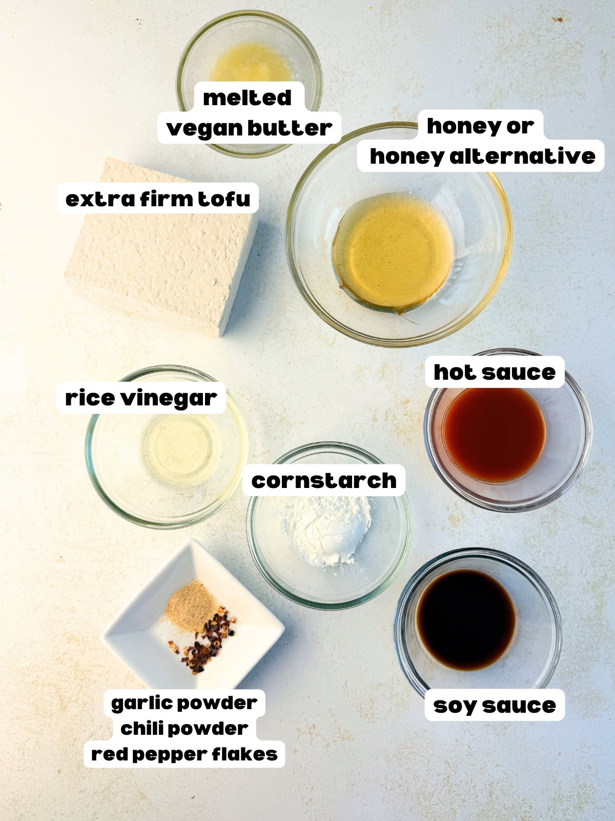 - While your tofu is cooking, whisk together your hot honey sauce by combining all the sauce ingredients in a small bowl.3 tbsp honey, 2 tbsp water, 1.5 tbsp hot sauce of choice*, 2 tsp soy sauce, 1 tsp rice vinegar, 1 tsp cornstarch, 1/2 tsp garlic powder, 1/4 tsp chili powder, 1/4 tsp red pepper flakes, 1 tbsp melted vegan butter
