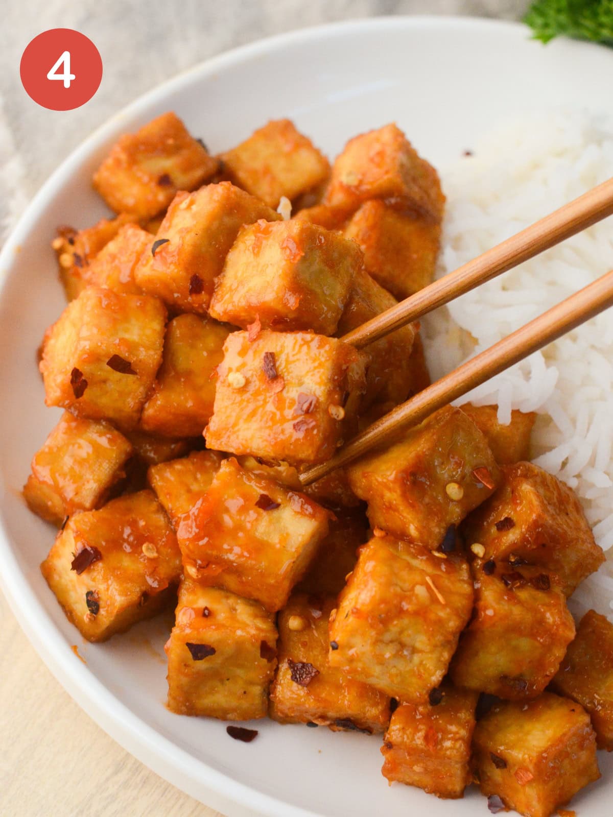 Heat a large saucepan over medium heat. Add your cooked tofu and the hot honey sauce. Toss the tofu in the sauce until completely coated. Warm over the stove, stirring occasionally, until the sauce has caramelized on the tofu (see photo below for what it should like