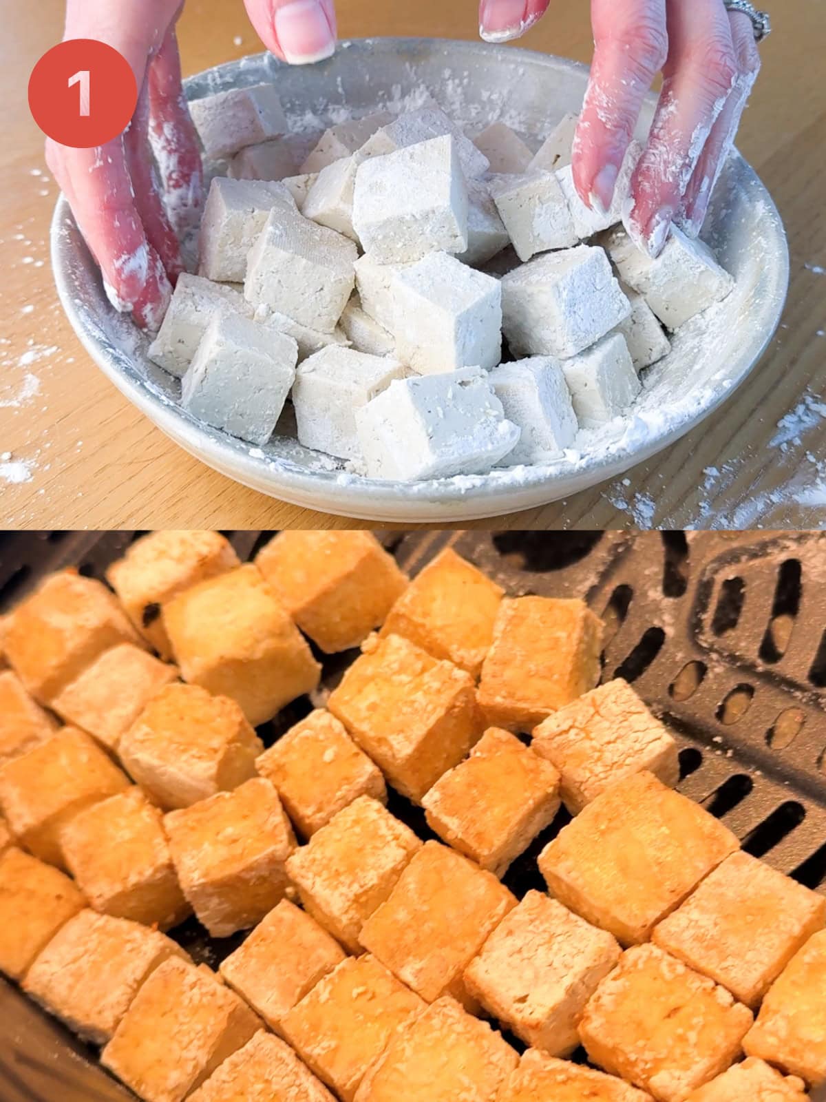 - First, if you have not pressed your tofu make sure you do this for at least 20 minutes. Blot dry with a paper towel or dish cloth.Cut your tofu into 1.5-2 inch cubes. Toss with 1 tbsp of cornstarch.Air fry your tofu at 400° F for 10-15 minutes, shaking halfway, until it is golden and crispy on the outside. No air fryer? No worries! Bake your tofu at 400° F for 20-25 minutes, flipping halfway, until golden to your liking.16 oz extra firm tofu, 1 tbsp cornstarch