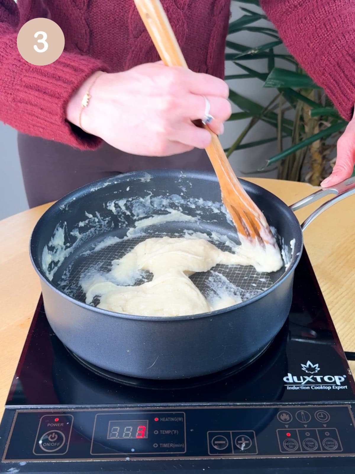 Turn up stove to medium heat and SLOWLY add the milk, whisking as you add it. Continue to whisk and in 1-2 minutes the mixture will start to thicken QUICKLY. Continue whisking until it forms a thicker dough. Once the dough has formed immediately remove from heat so it doesn’t burn.