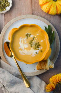 This creamy pumpkin soup is a fall fan-favorite. My version has the perfect blend of spices like curry, sage, and cinnamon that add warmth and depth of flavor. I love the addition of apple which adds a subtle sweetness and brightness that you don’t find in other pumpkin soups.
