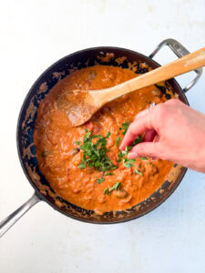 Add your can of crushed tomatoes and pasta water. Turn the heat up slightly to get it to a simmer. Let it cook for 5 minutes so the flavors of the sauce meld. Turn the heat off and remove half of the sauce and add to a blender. Blend until smooth and pour back into the pan. (Caution - it will be hot!)FYI - I’d skip the immersion blender—this sauce has a tendency to splatter! 15 oz crushed tomatoes, 1/3 cup pasta water